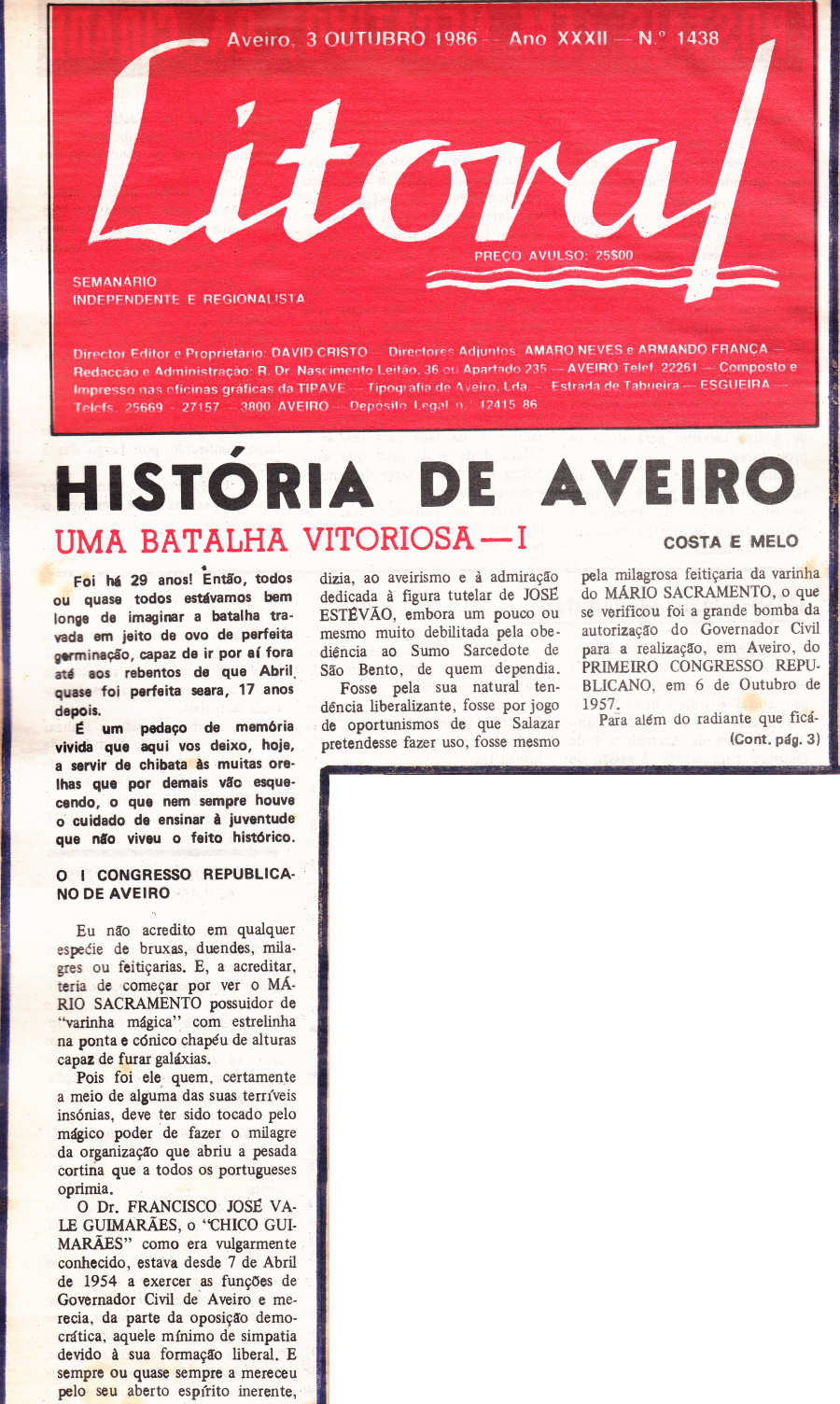 Neste artigo, Costa e Melo recorda o 1º Congresso Republicano, na