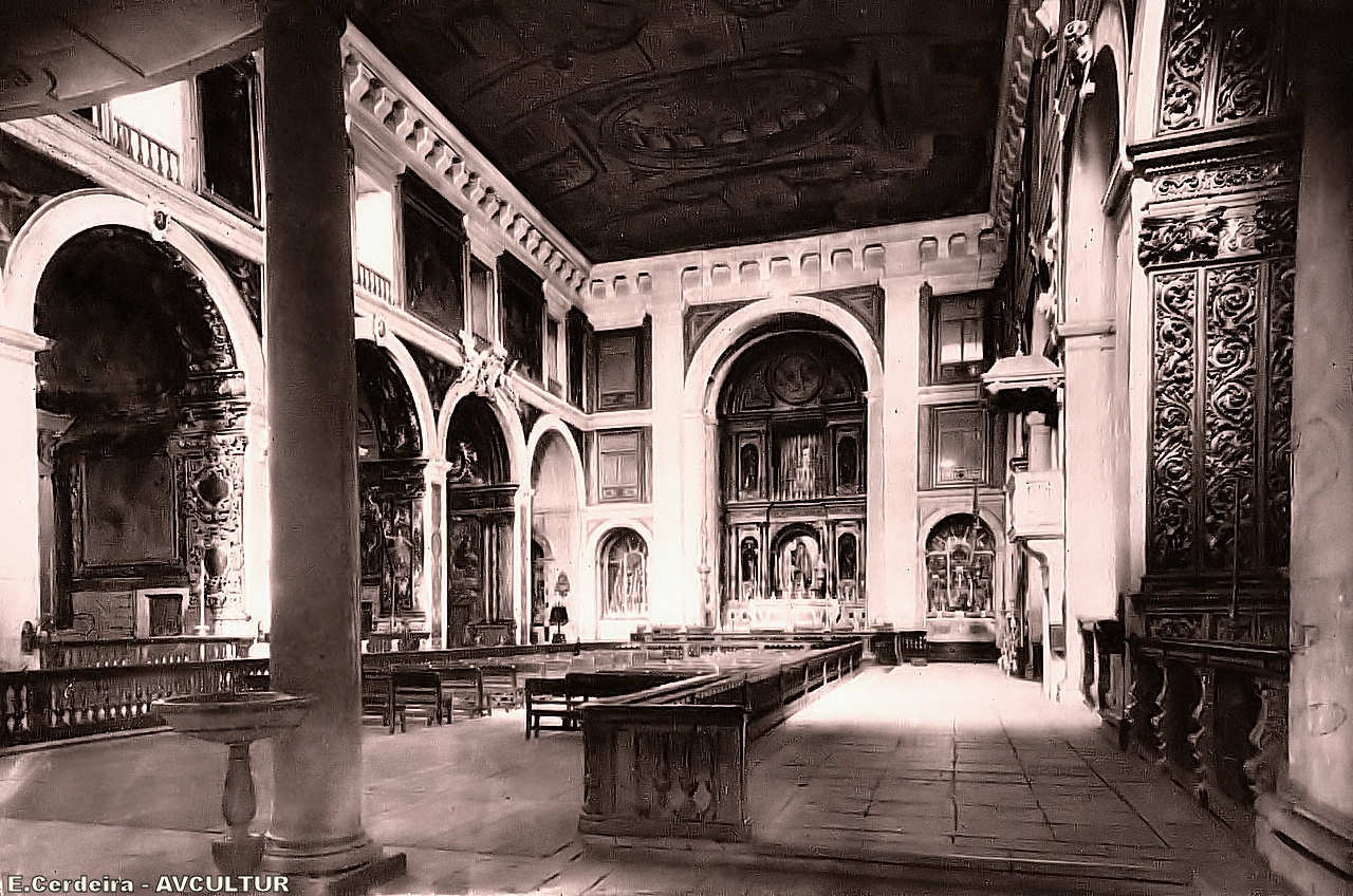 S. ROQUE – INTERIOR DO TEMPLO, de uma só nave, belamente decorada com folha dourada, de notável valor artístico, mármores, azulejos e mosaicos. – O tecto de madeira, pintado em 1599, é considerado um perfeito exemplar da época.