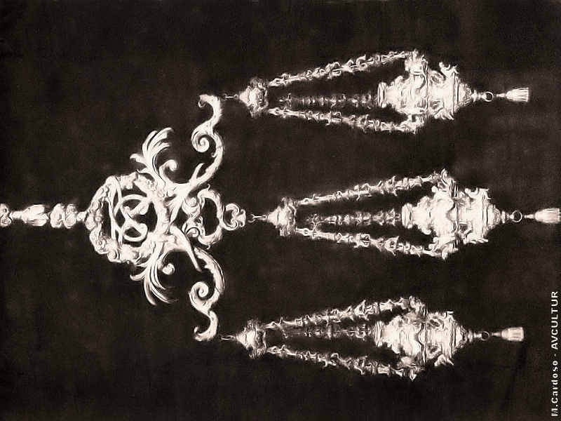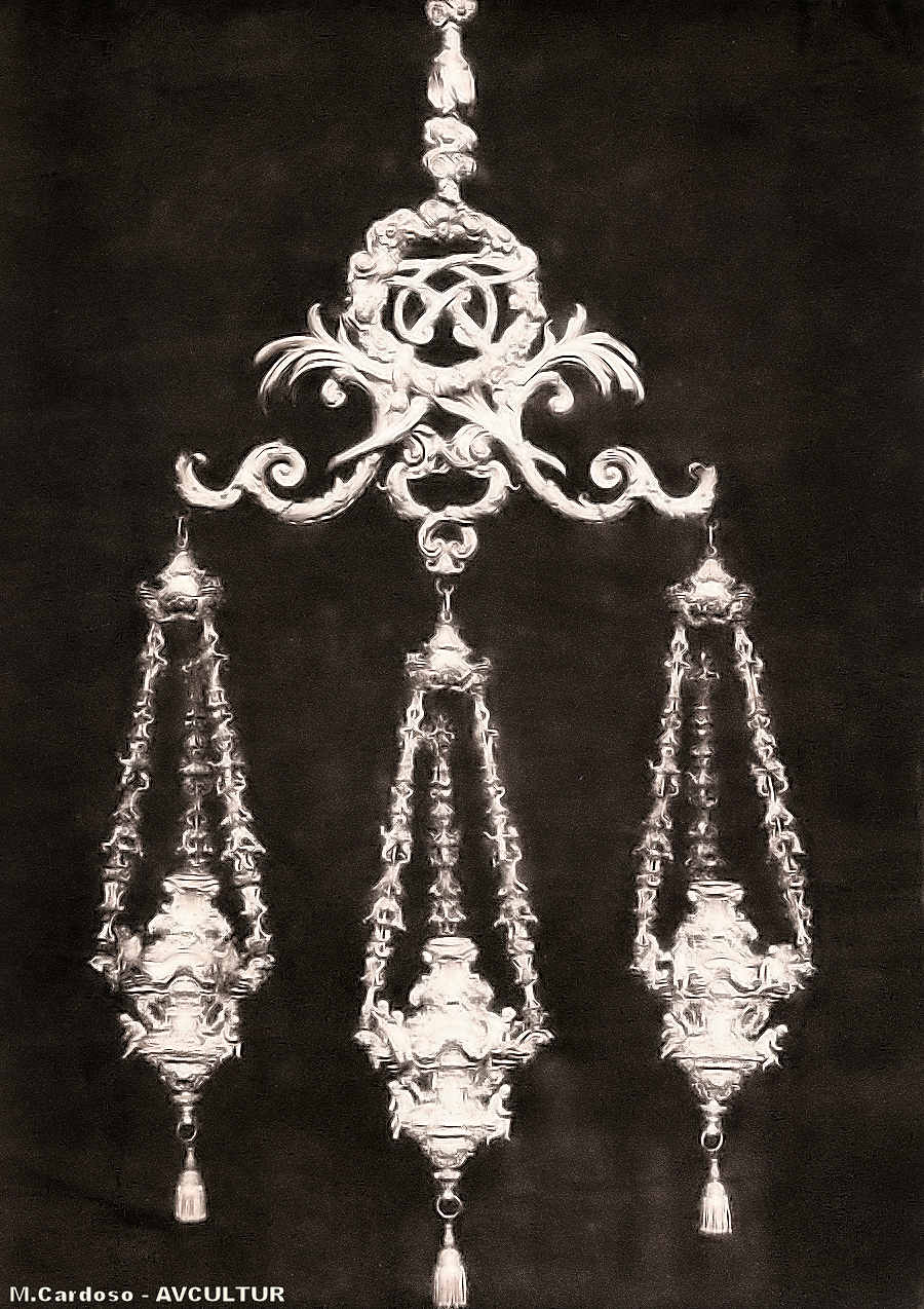 S. ROQUE – LAMPADÁRIO DA CAPELA , em bronze doirado, lavrado por Ângelo e Guisseppe Ricciani. – As lâmpadas, de prata e metal doirado, são obra de Miglie.