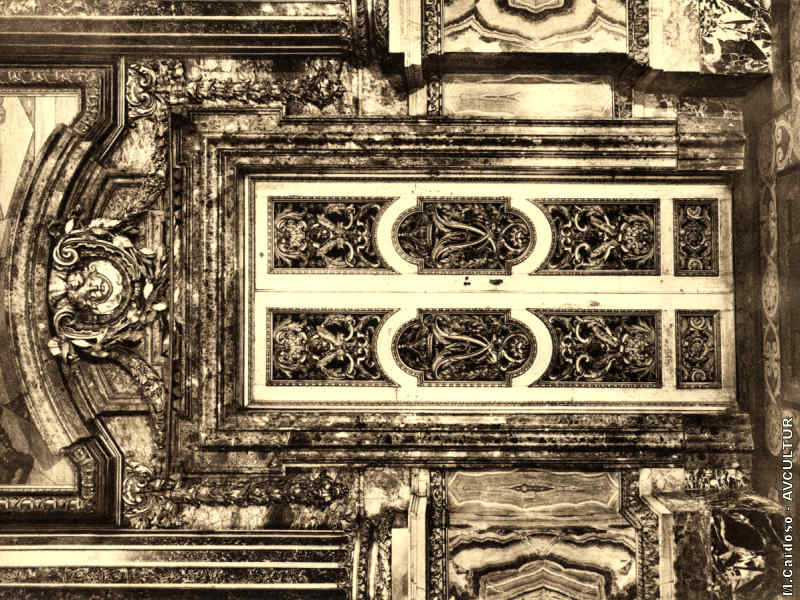S. ROQUE – UMA DAS PORTAS LATERAIS da Capela, em bronze doirado (Silvestre Dória). As ombreiras são de verde antigo, espelhos de diáspora dura e conchinhas de ametistas.