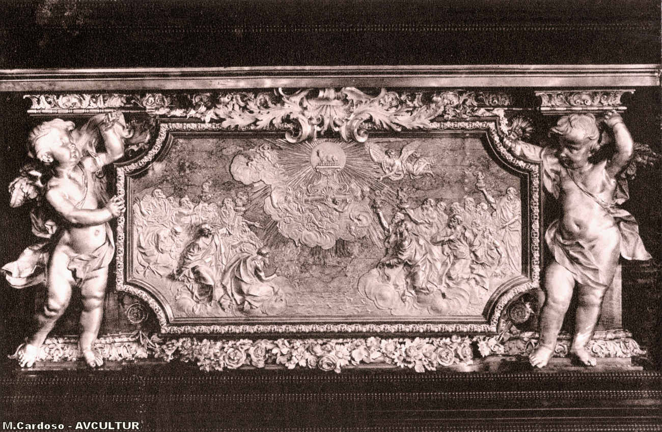 S. ROQUE – MUSEU. – FRONTAL de prata e lápis-lazúli, que servia em dias de maior solenidade, execução de António Arighi. – O baixo relevo que ocupa o centro representa uma passagem do apocalipse, superiormente trabalhada e movimentada.