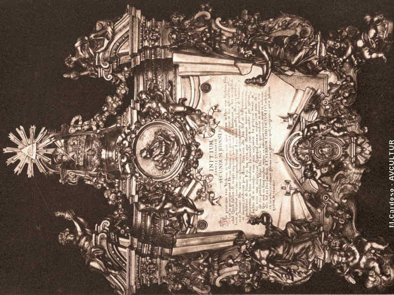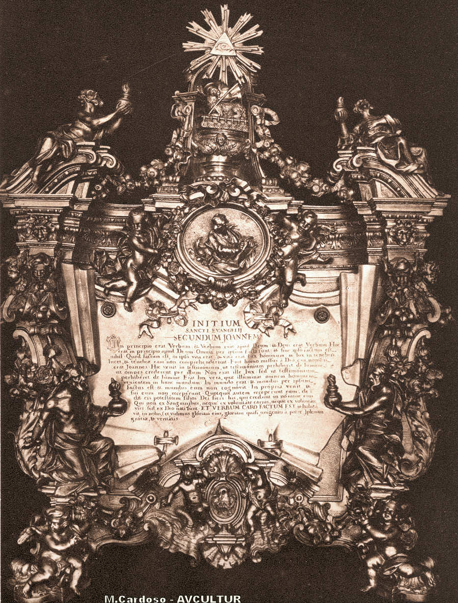 S. ROQUE – MUSEU. – Uma das SACRAS PEQUENAS, em prata dourada, obra notável de Vendetti. – No medalhão superior, S. João Evangelista. O inferior representa o Pelicano.