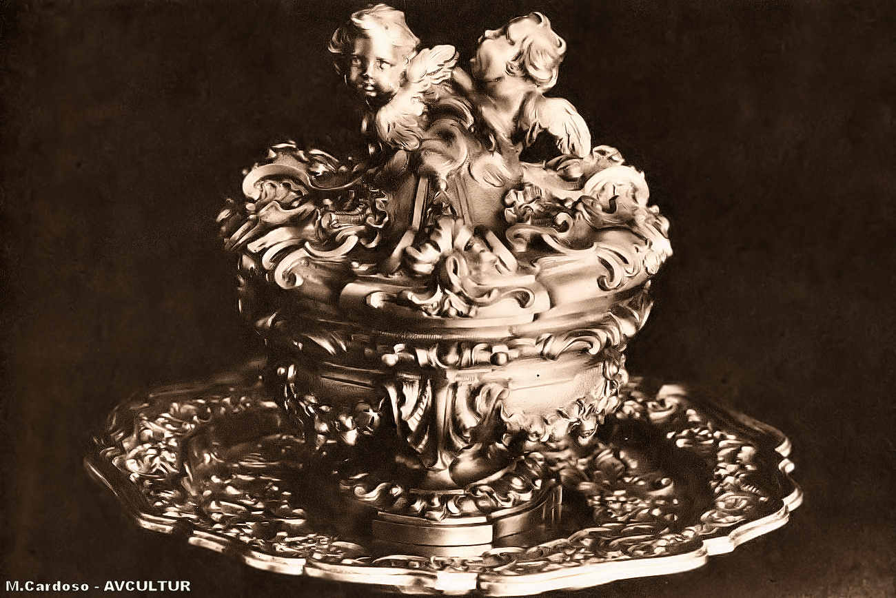 S. ROQUE – MUSEU. – PURIFICADOR com tampa e prato, ricamente ornamentado com florões dourados. – Pesa 1.140 gr. e foi executado por António Gigli. – É uma peça de ourivesaria, encantadora e de um raríssimo valor artístico.