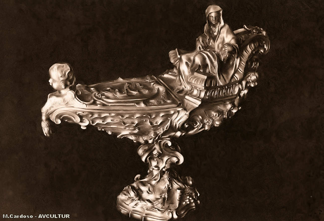 S. ROQUE – MUSEU. – NAVETA de prata dourada, tendo na popa as armas portuguesas, sustentadas por dois anjos. – A figura sentada empunha um cálice. – A base, muito movimentada, evoca o mar, de ondas finamente estilizadas. – Trabalho de A. Gigli.