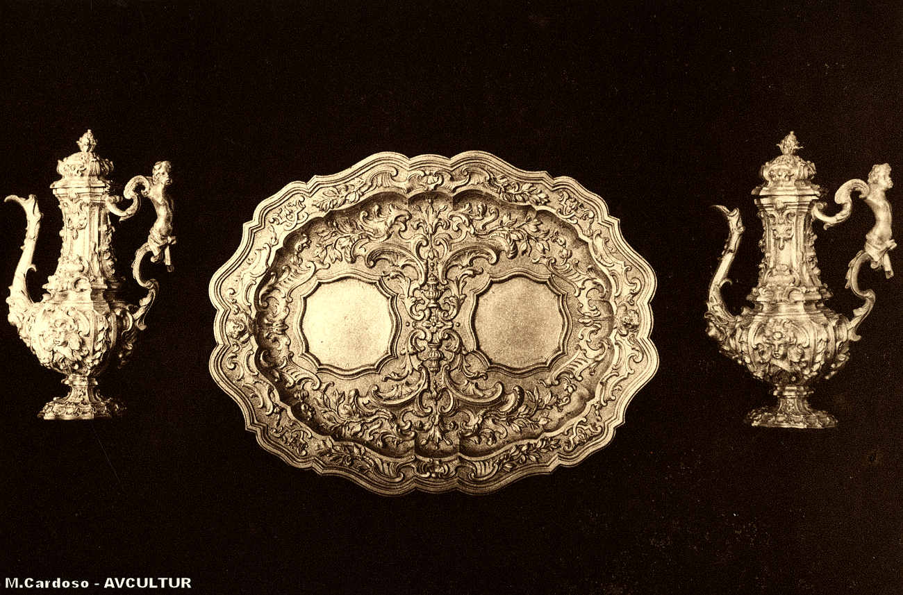 S. ROQUE – MUSEU. – GALHETAS com salva, de prata dourada, ornamentadas com finos medalhões e na nascença dos bicos. – Três peças de delicado gosto artístico, preciosamente cinzeladas pelo afamado ourives italiano António Gigli.