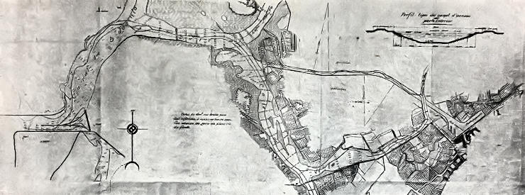 Começaram-se as obras das motas em 1879; em 1886 estavam construídos 2.365 metros da margem direita, e 1.824 metros