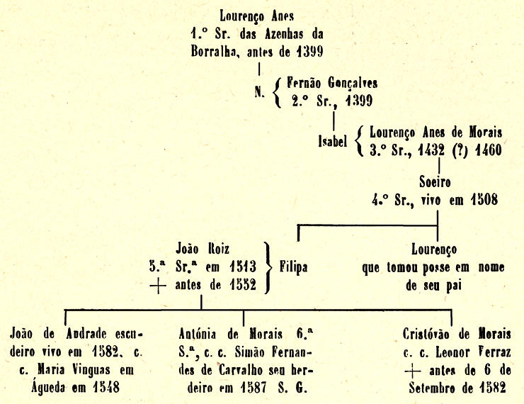testemunhas adiante espritas cõpareceu Lourenço Anes de Moraes ffilho do dito Ssoejro de Moraes, Senhorio das ditas azenhas»,... (doc. do A. da C. da B.) o qual vinha requerer para