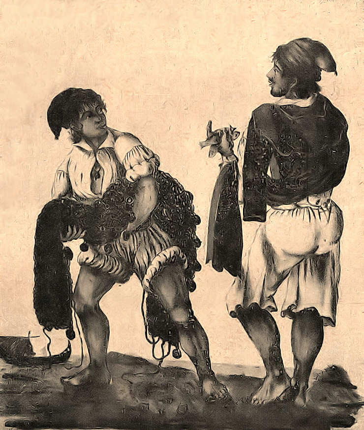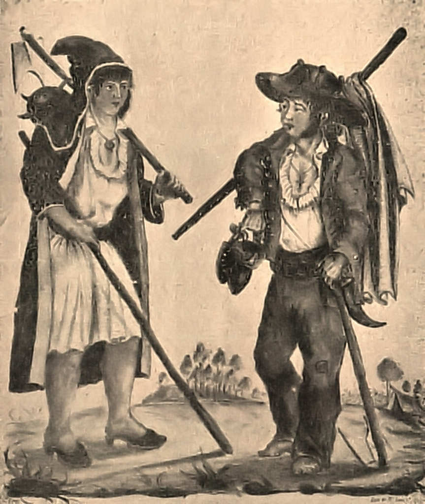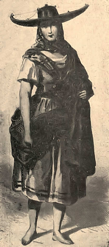 de feltro de larga aba revirada, aventais de serguilha, manaias