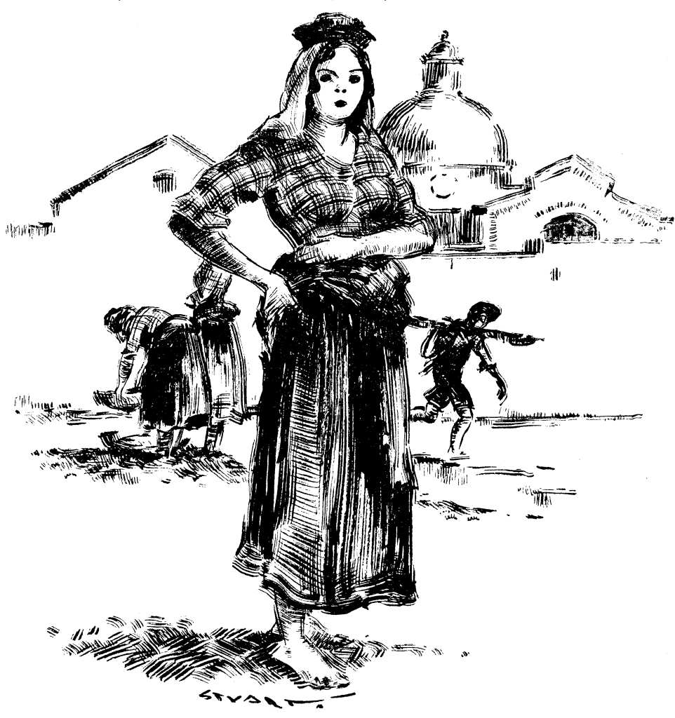 lançava pelas costas um lenço dobrado em bico, que vinha cruzar no