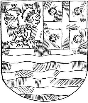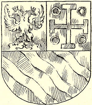 duas cabeças de prata, coroadas de oiro partido de azul, cruz de oiro