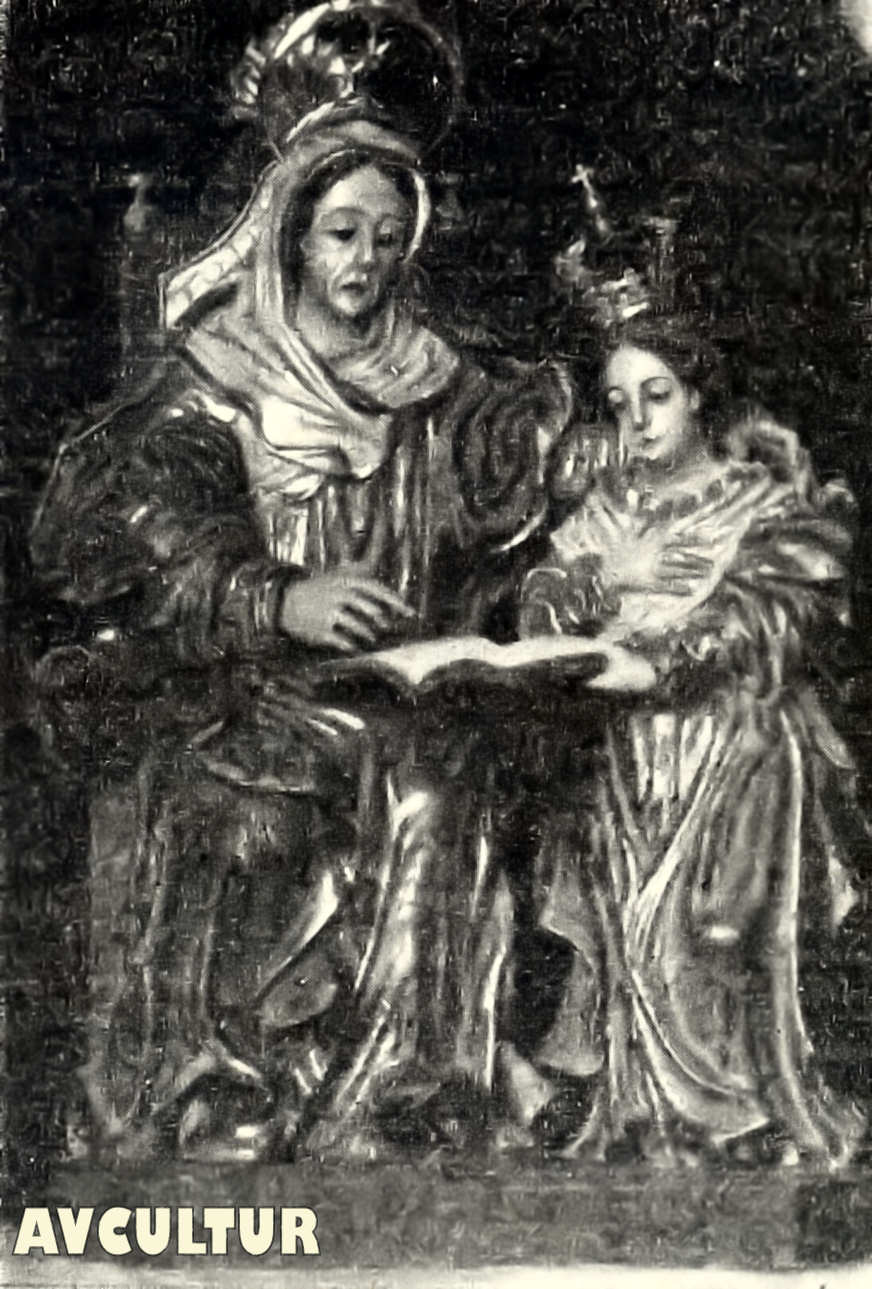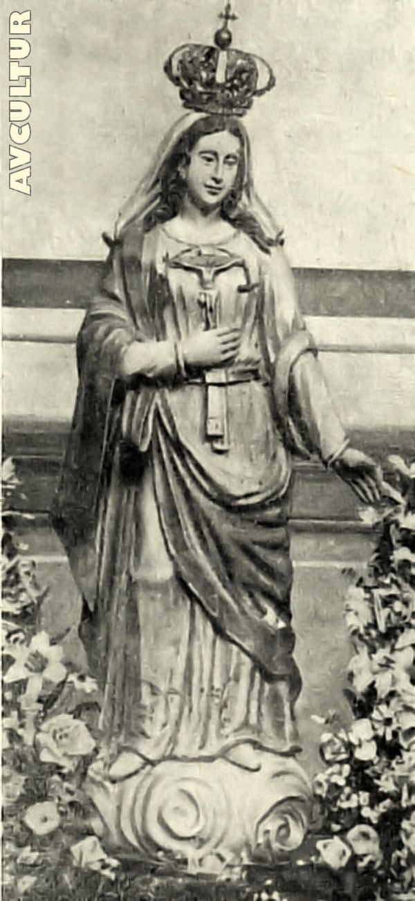 Maria, ladeando-a, à direita, a imagem de S.ª Agueda, e à esquerda a de