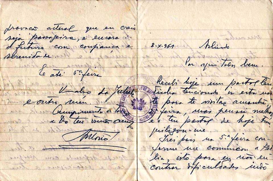 5 - Páginas 1 e 4 - Carta do irmão a Arlindo Vicente datada de 8-10-1961 com o carimbo da PIDE.