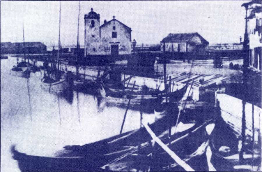 1870 - Canal central. Rossio de S. João e respectiva capela que seria demolida a partir de 3 de Novembro de 1910. À direita, um palheiro da marinha de sal.
