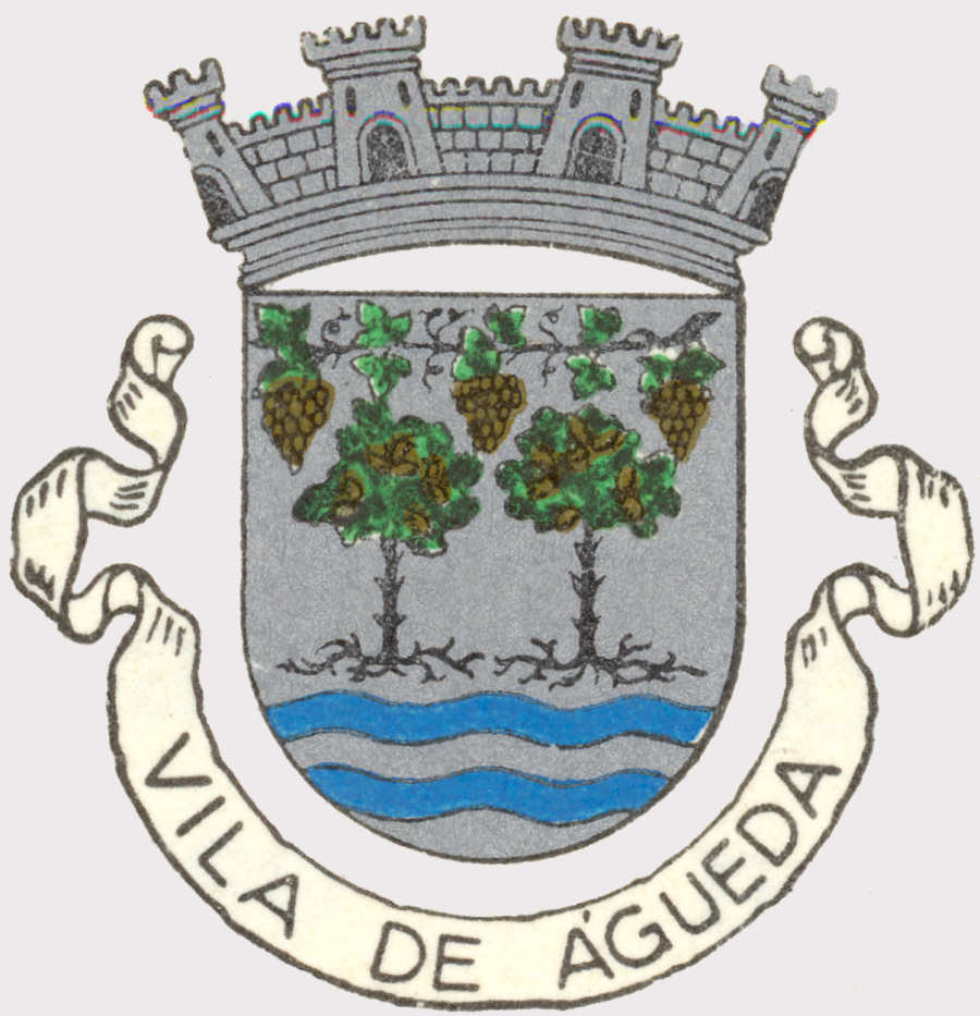 Armas: de prata, com dois pinheiros de verde, troncados e arrancados de negro e frutados de ouro. Em chefe, uma vide de negro em faixa, com três cachos pendentes de ouro, folhadas de verde. Em contra-chefe, duas faixas ondadas de azul. Coroa mural de quatro torres de prata. Listel branco com os dizeres «Vila de Águeda» a negro.