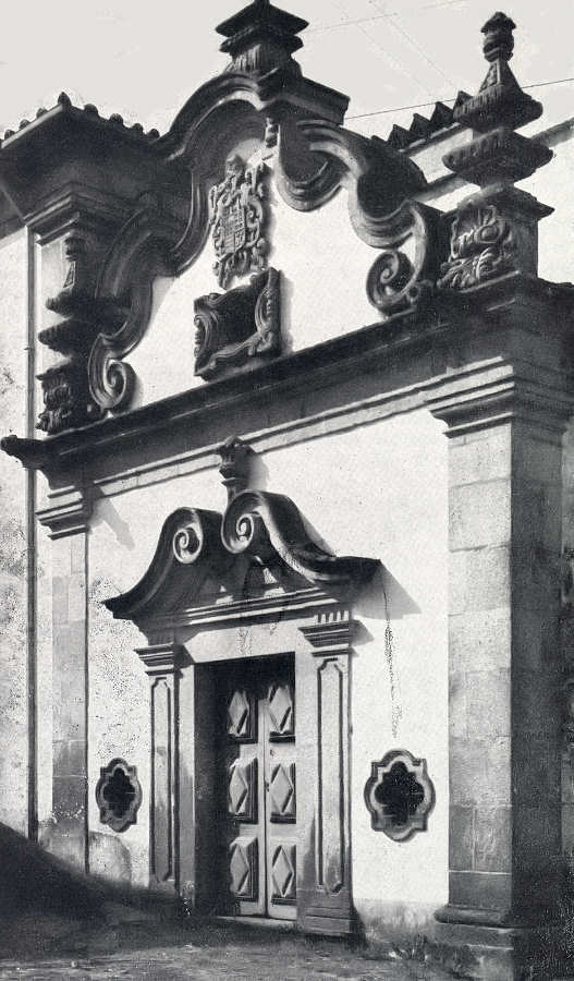 CAPELA DA CASA DE CELA (Urrô-Arouca). A frontaria dos meados do século XVIII é um dos destacados exemplares em capelas anexas a casas tradicionais que o distrito possui. Na empena, brasão de Moreiras, Melos, Magalhães, Pintos, com timbre dos primeiros (N. G.)