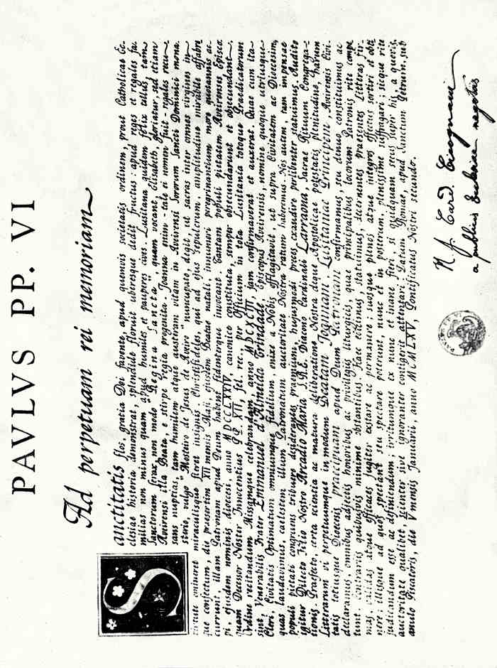 Breve Pontifício «Sanctitatis Flos» do Papa Paulo VI, de 5-1-1965.