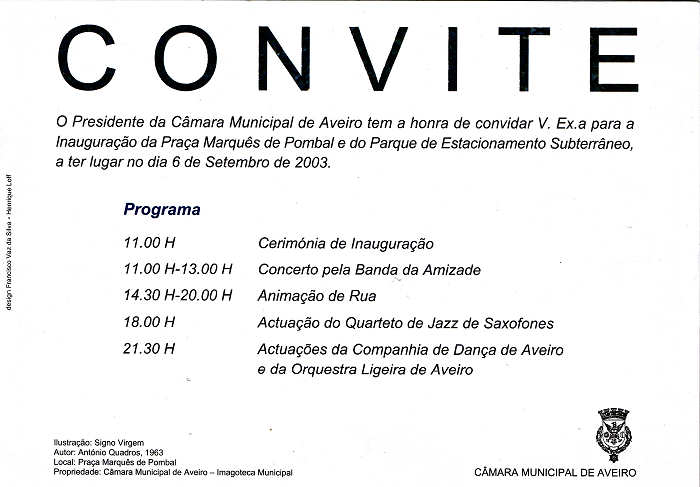 2003-09-06 — Neste dia foi inaugurada a Praça Marquês de Pombal e respectivo estacionamento subterrâneo, conforme consta do convite editado pela edilidade aveirense, consultável na rubrica postais. – HJCO