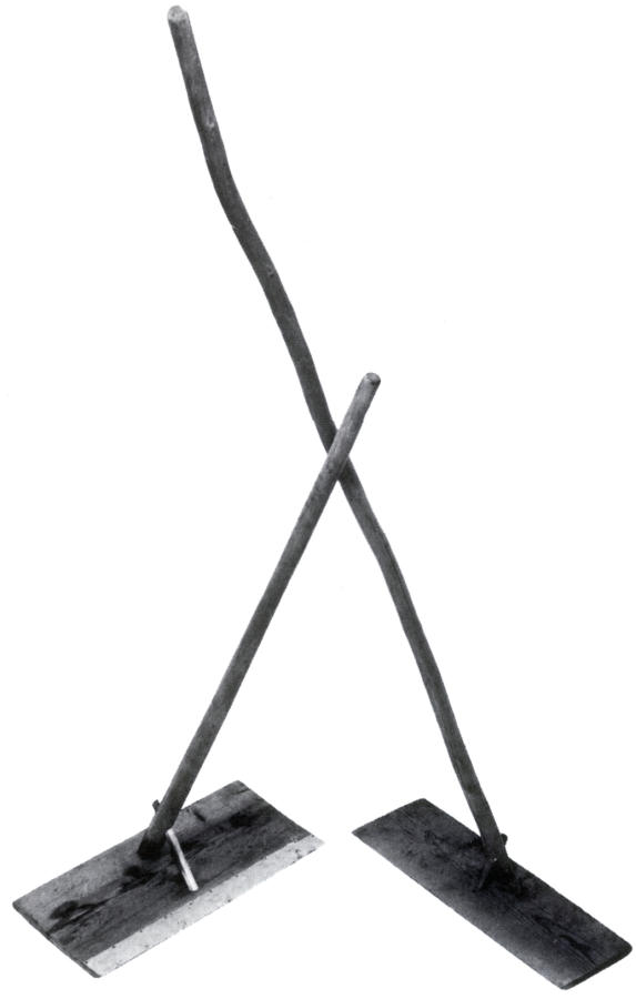 Alfaia em ferro, com um gume em cunha, nascendo de uma base plana, que