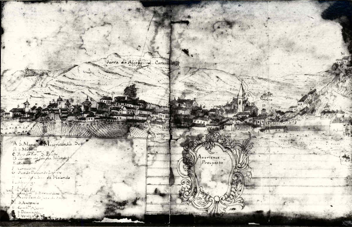 Original existente no Museu Regional. Averiensis Civitatis Planispherium cum ipsius (palavra cortada) sub Vrbis. Petit pie de 10 Varas.