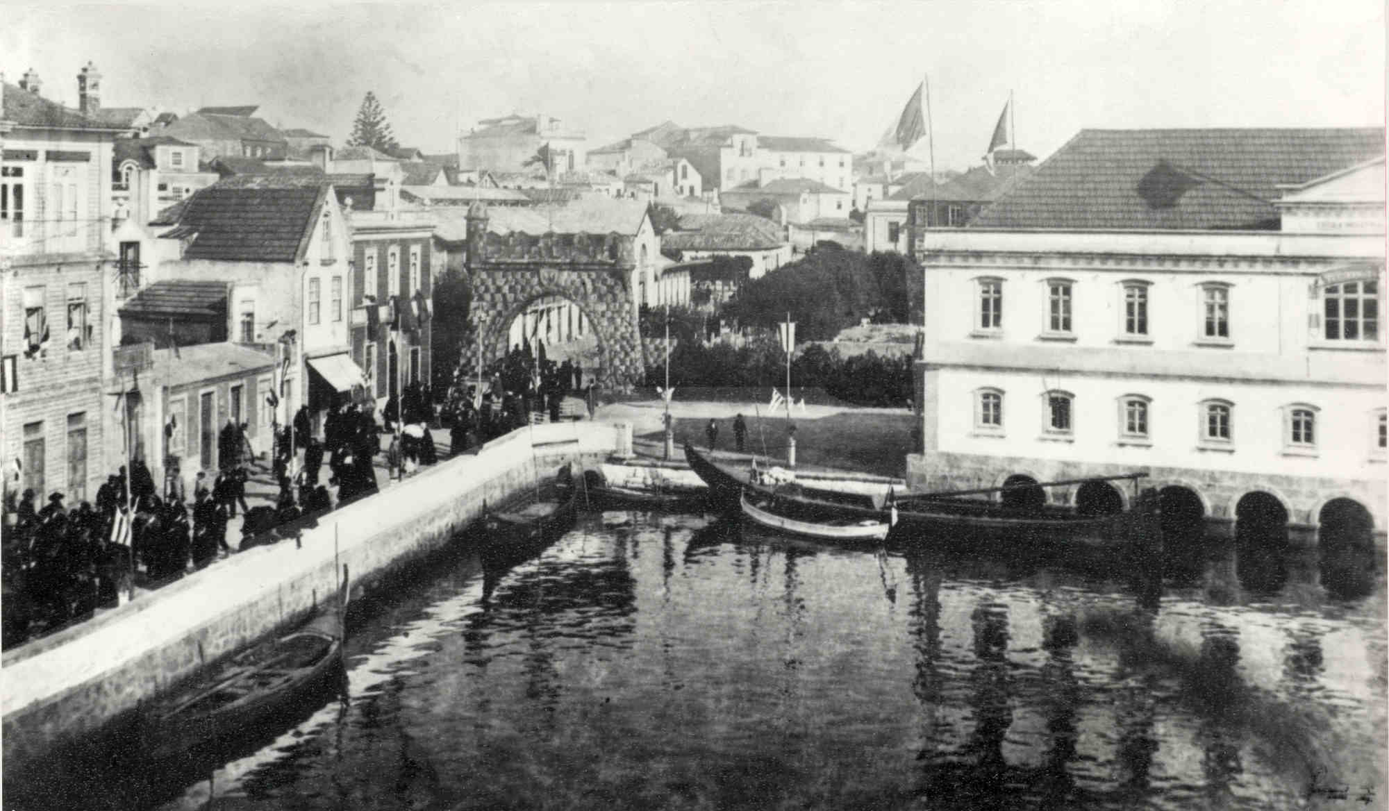 148 e 149. Rua Bento de Moura com uma reconstituição de uma das portas das muralhas da cidade, por ocasião da visita de El-Rei D. Manuel II a Aveiro, em 27/11/1908. À direita, a antiga Escola Industrial Fernando Caldeira, posteriormente a Capitania do Porto de  Aveiro. Ver também <<<< >>>>