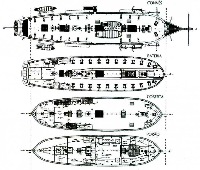 À popa há os alojamentos do pessoal, a câmara dos oficiais, equipada com mesa posta completa, cadeiras, diversos móveis, etc. Aí existirão 3 manequins de oficiais, fardados à época, em posições funcionais, o camarote do médico-cirurgião e o camarote do navegador, com manequim sentado frente à mesa a trabalhar numa carta de navegação. A botica vai estar completamente equipada com o material médico da época, fármacos e remédios cedidos pela Associação Nacional das Farmácias que obteve o material no seu bem apetrechado Museu da Farmácia; e também algumas peças e material cedido pelo Hospital de Marinha. A nível da coberta, a vante, vai haver um grande espaço que era ocupado pelas mesas às horas das refeições ou pelas macas, à noite, às horas de dormir. Esse espaço vai ser recreado com duas mesas para a marinhagem, baixadas em posição, postas com palamenta adequada; e ainda no outro bordo 3 macas no ar, penduradas, com manequins em posição de / pág. 20 / dormir. Também a vante na coberta será recreado um pequeno camarote de passageiros com 3 manequins — um casal e uma criança pois o navio também algumas vezes transportava passageiros. Na parte mais a vante da coberta vai haver, num bordo, o camarote do mestre e no outro bordo, o camarote do carpinteiro, com anexos do paiol do mestre e oficina de carpintaria. Estes espaços não serão apetrechados para a EXPO'98 por causa do tempo disponível, mas sê-Io-ão mais tarde. No bico de proa irá ser montada simbolicamente a enfermaria, que não tinha local fixo, por causa do tempo e mar, ficando a sua colocação a bordo ao critério do comandante. Aí vai ser colocado o cirurgião-médico em manequim e também um doente manequim.