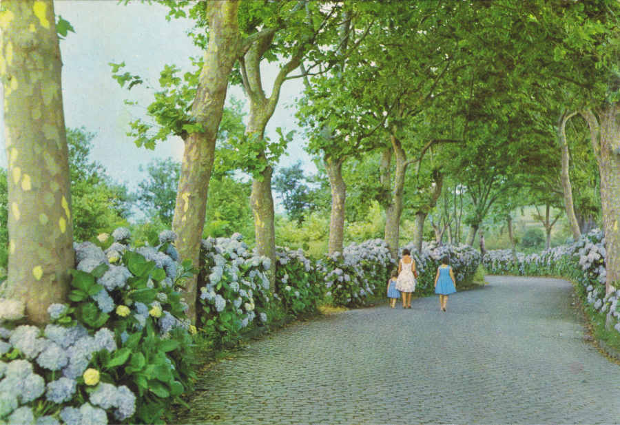 N.º 6 - S. MIGUEL (Açores) Estrada com Hortênsias - Ed. Fotografia Nóbrega, Lda, Ponta Delgada - S. MIGUEL - AÇORES - Lito Of. Artistas Reunidos, Porto - SD - Dim. 14,9x10,5 cm. - Col. Manuel Bóia (1981).