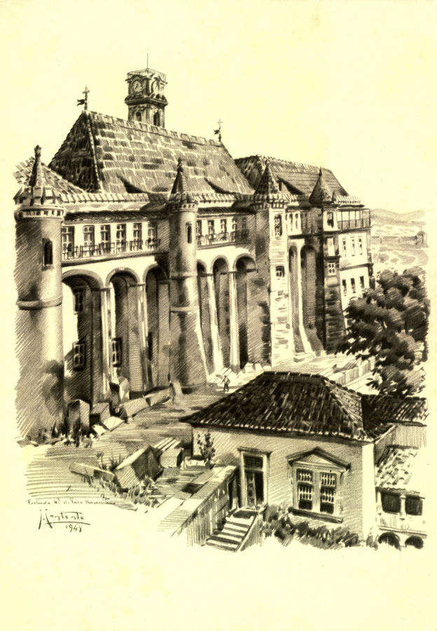56 - Fachada norte da universidade. Gravura de A. Contente, 1948.