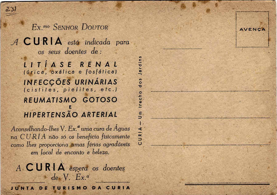 347. Verso de um postal publicitário editado pela Junta de Turismo da Curia. Data?