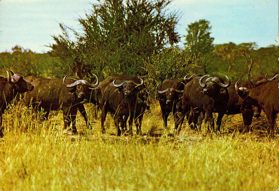 1. N.º B6/18 - BUFALOS (SYNCERUS caffer caffer) - Publicado pela Sociedade de Safaris de Moçambique (SARL) com autorisação de Big Game Photography - S/D - Dimensões: 15x10,2 cm. - Col. Manuel Bóia (1970).
