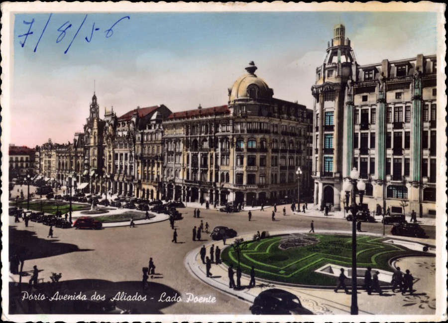 81. Avenida dos Aliados, Poente (circulado em 1956).   82. Pontes D. Luís e D. Maria II (circulado em 1965).   83. PORTO. Muralha de D. Fernando   84. Grande Hotel da Batalha, Hall (Postal de Boas-Festas e um Novo Ano cheio de prosperidades).