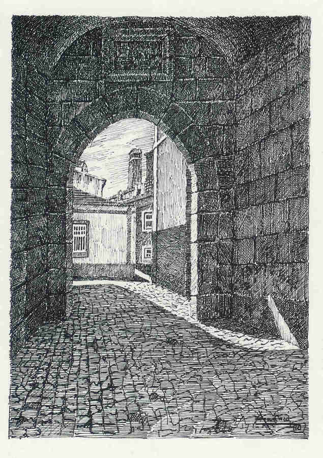 Nº 01 - Porta de Santiago - Desenho de Arsénio da Ressurreição - Edição Associação de Estudos e Defesa do Património Histórico-Cultural de Santarém - 1990 - Dim. 10,5x15,1cm - Col. Miguel Soares Lopes