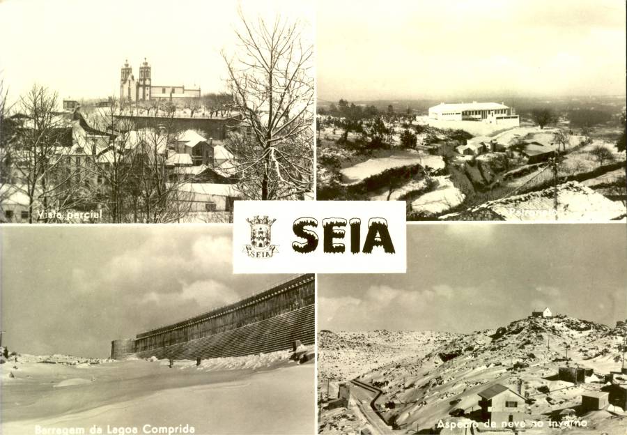 S/N - SEIA Vista parcial; Patronato; Barragem da Lagoa Comprida; Aspectode neve no Inverno - Edição da CASA HAVANEZA, Residência Serra da Estrela, Seia - S/D - Dimensões: 14,7x10,4 cm. - Col. HJCO