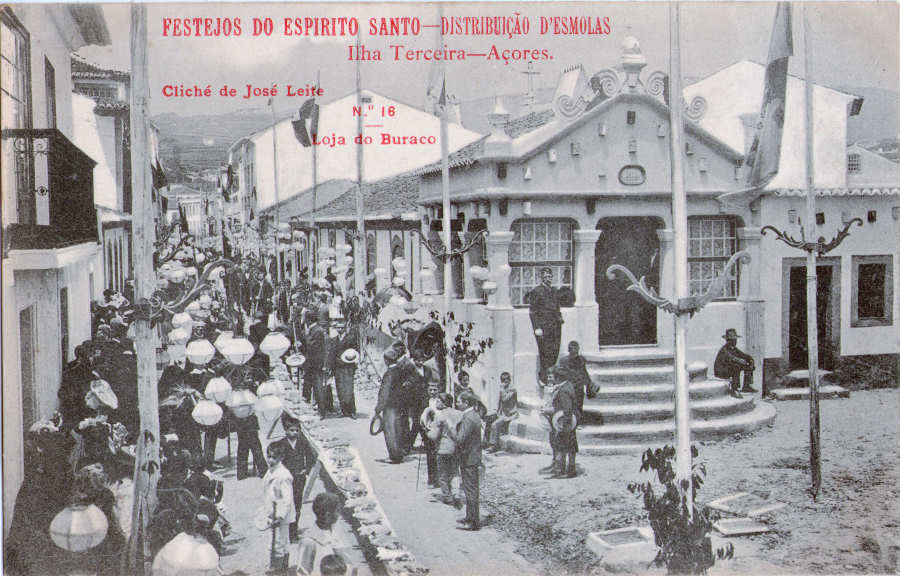 Nº 16 - Festejos do Espírito Santo, Distribuição d'Esmolas - Edição da Loja do Buraco, Cliché José Leite - Dim. 137x88 mm - Usado em 28DEZ1910 - Col. A. Monge da Silva (anterior a 1910)
