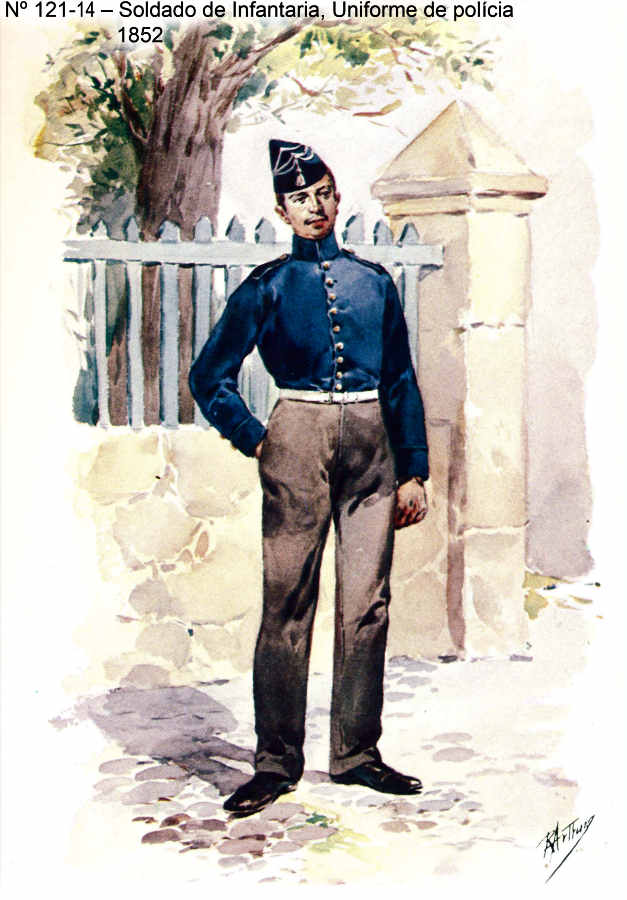 Nº 121-14 - Soldado de Infantaria, Uniforme de polícia, 1852 - Aguarela do Cor. Ribeiro Artur - Edição Jornal do Exército, 1985 - Dim. 15x10,3 cm - Col. A. Monge da Silva