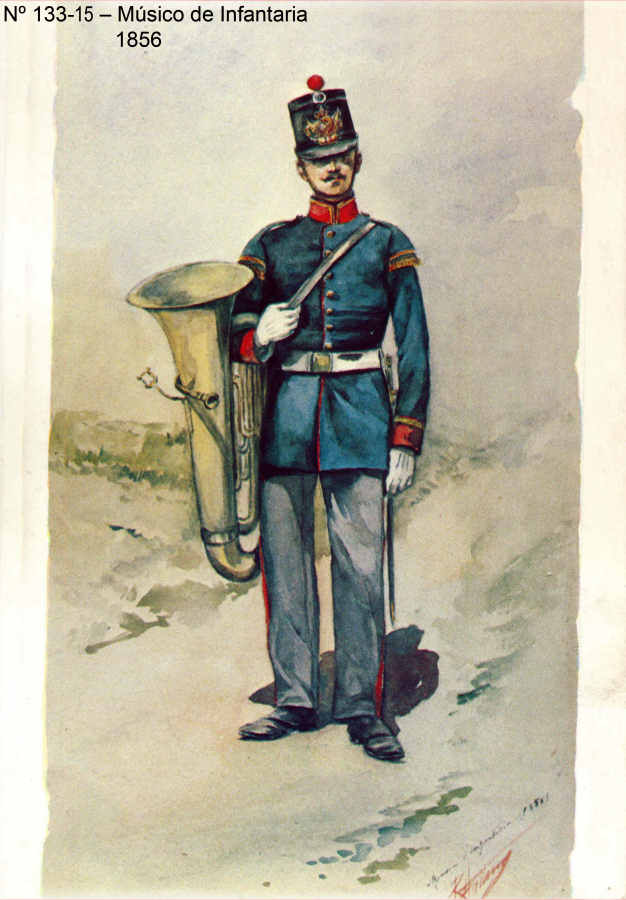 Nº -15 - Músico de Infantaria, 1856 - Aguarela do Cor. Ribeiro Artur - Edição Jornal do Exército, 1985 - Dim. 15x10,3 cm - Col. A. Monge da Silva