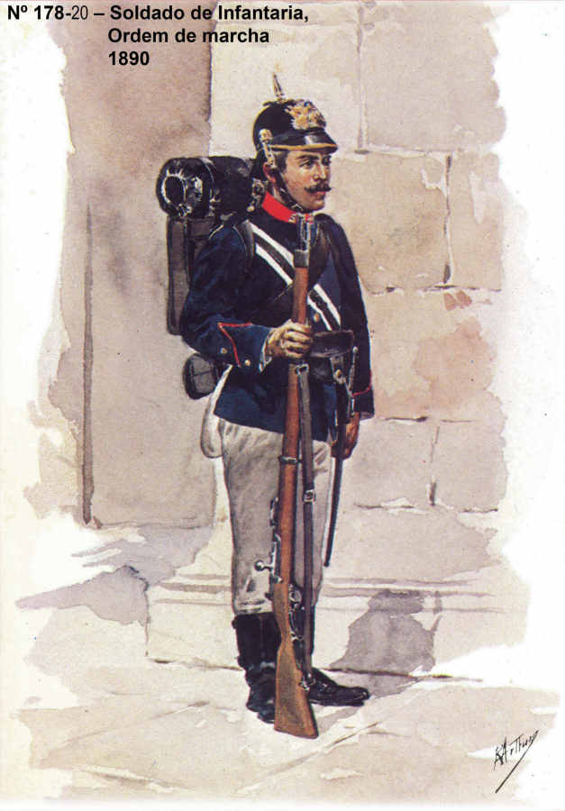 Nº 178-20 - Soldado de Infantaria, Ordem de marcha, 1890 - Aguarela do Cor. Ribeiro Artur - Edição Jornal do Exército, 1985 - Dim. 15x10,3 cm - Col. A. Monge da Silva