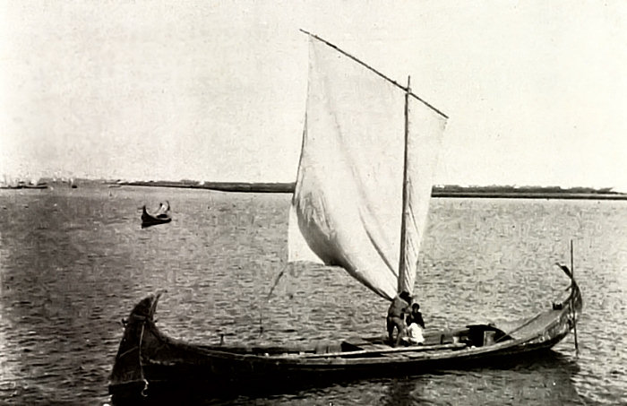 a vela num barco moliceiro - Cliché de Mendes da Costa, 1908 |