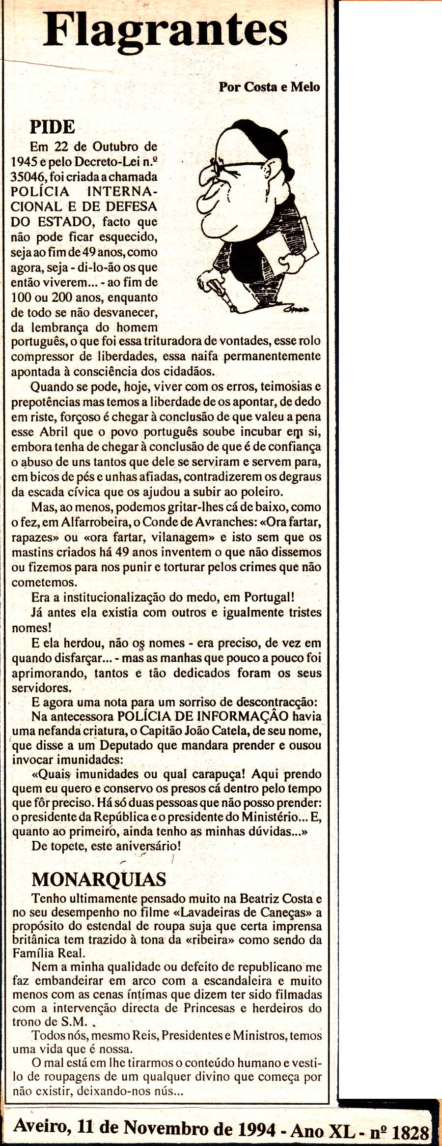 Síntese - Passados quarenta e nove anos da sua criação, Costa e Melo relembra a PIDE - POLÍCIA INTERNACIONAL DE DEFESA DO ESTADO - , "...essa trituradora de vontades, esse rolo compressor de liberdades, essa naifa permanentemente apontada à consciência dos cidadãos.", para que na memória colectiva não se volte a criar "...a institucionalização do medo, em Portugal!"
