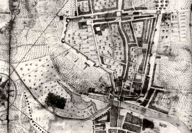 Fig. 1 - Mapa de finais do séc. XVIII (autor anónimo espanhol). Canal Central com duas pontes. Parte superior da cidade muralhada. Canal da esquerda, correspondente ao esteiro do Côjo, tendo em conta as designações do mapa topográfico de 1780.