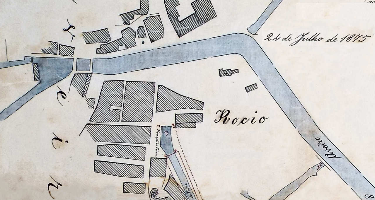 Fig. 4 - Neste mapa de 1904, o esteiro do Cojo praticamente desapareceu e o da Fábrica passou a ter o nome do desaparecido. A zona entre os dois esteiros tem agora edificações, que desaparecem com a abertura da Avenida Central, hoje Av. Dr. Lourenço Peixinho. O mapa mostra uma zona ajardinada, de formato trapezoidal, entre dois edifícios. Além do jardim, existia um «Campo da Feira dos 28», entre o «Esteiro do Cojo» e a «estrada para a estação» dos caminhos de ferro.