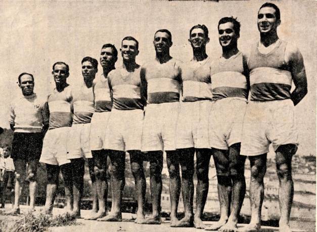 Equipa do Clube dos Galitos que, em 1945, representando Portugal ganhou, em «shell» de oito, o II Campeonato Peninsular. A contar da esquerda: Edgar Teixeira Lopes, Amadeu Moreira, Albino Neto, José Velhinho, João de Sousa, Carlos do Roque, António Mateus, João Cunha e Manuel Matos.