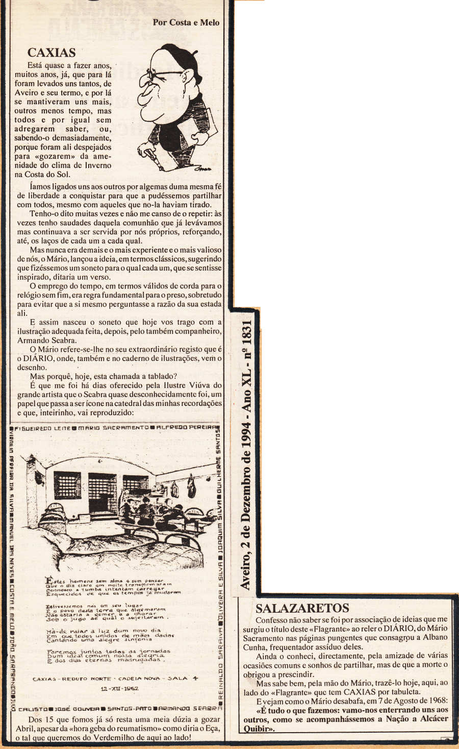 Síntese - Costa e Melo relembra, de novo, o ano de 1962 e a prisão de que ele e mais catorze companheiros foram vítimas, através da divulgação de um soneto composto por todos eles e ilustrado por um dos encarcerados -  Armando Seabra - a partir de uma ideia de Mário Sacramento (um dos quinze), em que cada um teria de criar um verso. A emoldurar o poema estão os nomes dos quinze presos.