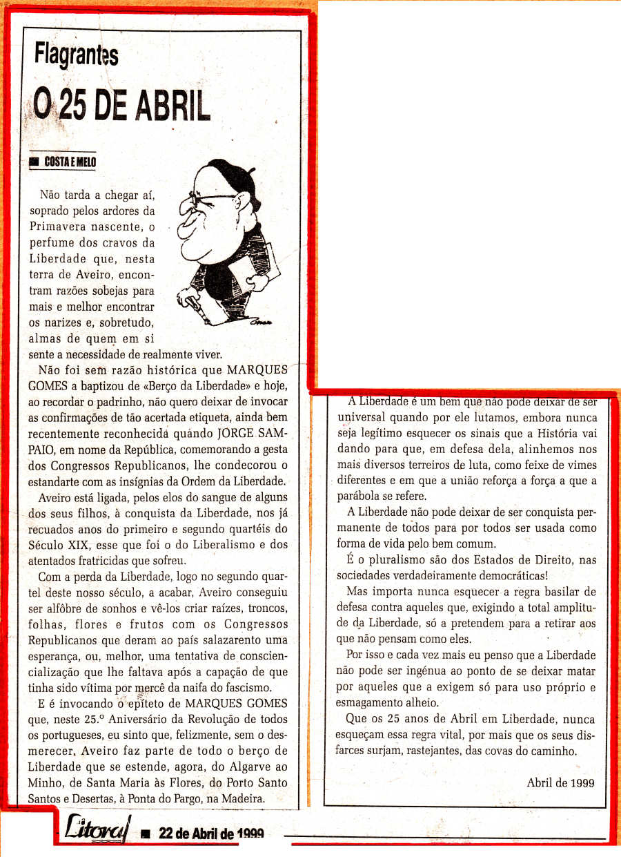 A propósito da comemoração de mais um aniversário do 25 de Abril que se aproxima (25º aniversário), Costa e Melo lembra as justificações históricas para Aveiro sentir de modo especial estas comemorações, numa evocação à revolução do 16 de Maio que originou a designação por Marques Gomes à cidade de “Berço da Liberdade”, bem como à posterior realização dos conhecidos “Congressos Republicanos” ou "Congressos Democráticos".