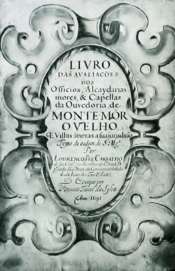 Entre esses livros, tive ocasião de ver o «Livro / das avaliações / dos I Officios, Alcaydarias / móres, & Capellas / da Ouvedoria de / Monte-Mor / O Velho, / E Villas ãnexas á sua jurisdição / Feyto de ordem de S. Mg.e / Por / Lourenço Piz Carvalho / do seu cons.º, seu Sumilher de Cortina, de / putado da Meza da Consciencia, & Ordës, / & da lunta dos Tres Estados. I Escripto por / Francisco Tinoco da Sylva. / Anno. 1691.»