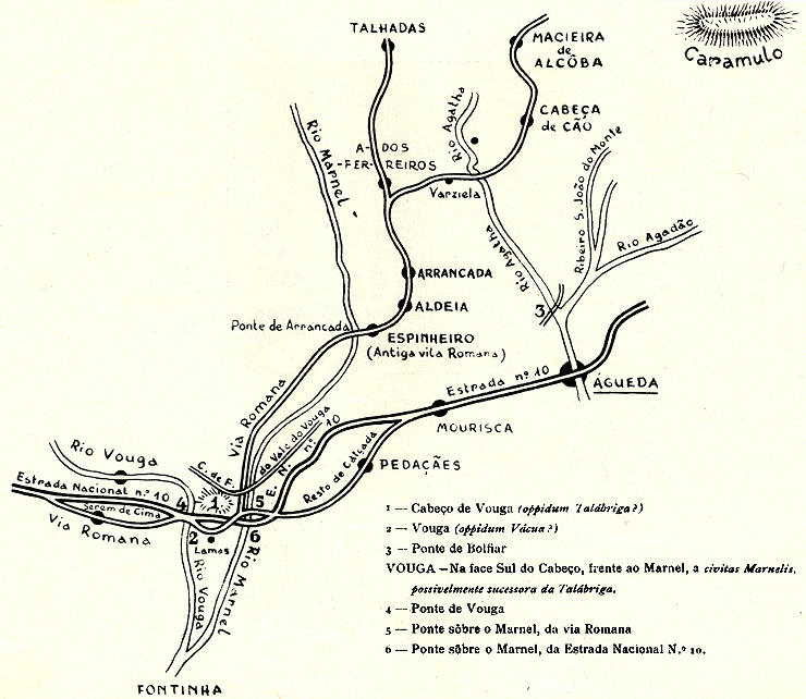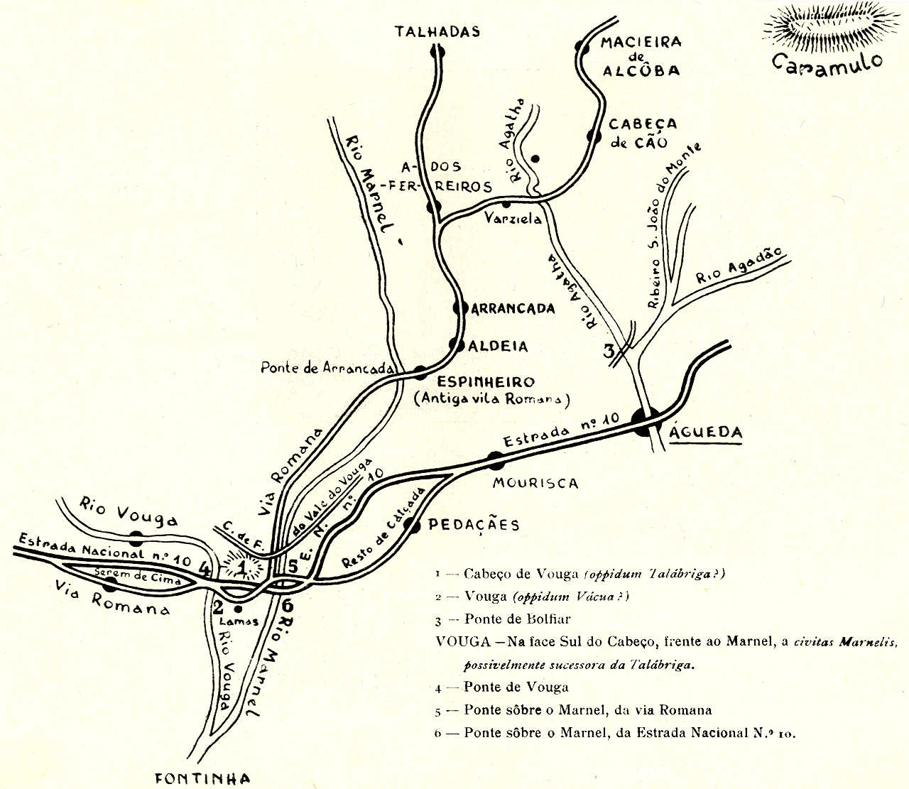 Traçado geral das vias romanas no concelho de Águeda, relacionadas