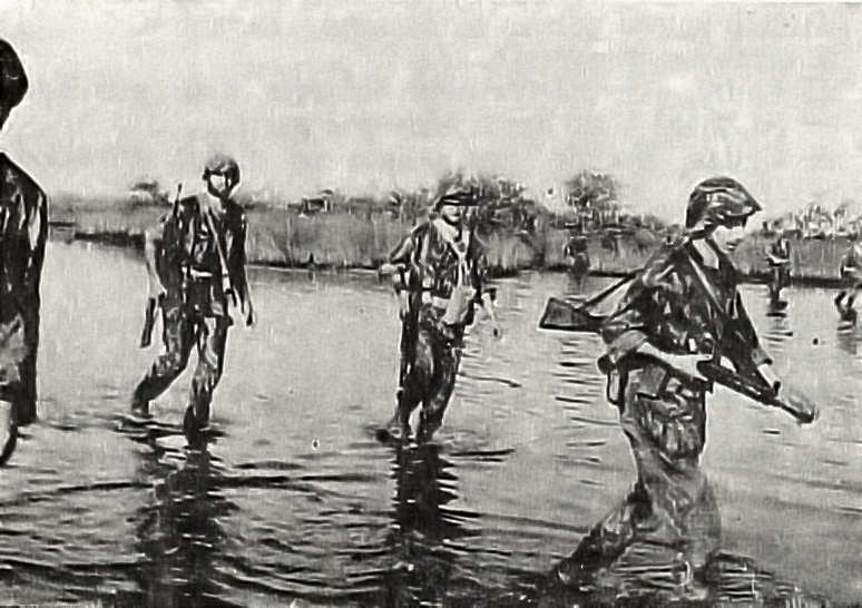 seguindo-me carregado de armas e capacetes. Rastejava. Na frente, o