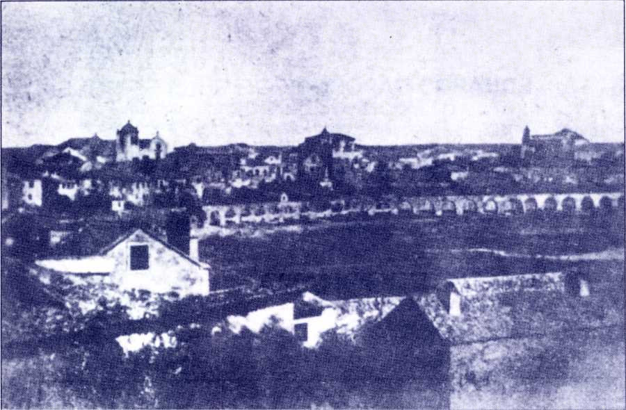 1870 - Vista do antigo "ilhote" e do aqueduto da fonte da Praça ou dos Arcos.
