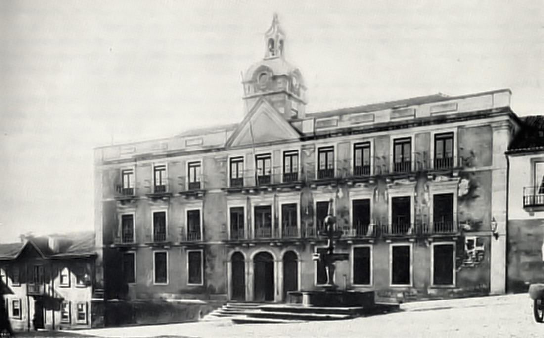 Publica-se uma nova fotografia que abrange o edifício depois de concluídas essas obras, a Casa da Secretaria (à esquerda), parte da casa que foi de D. Vitória de Lacerda, o chafariz e o típico candeeiro da época.