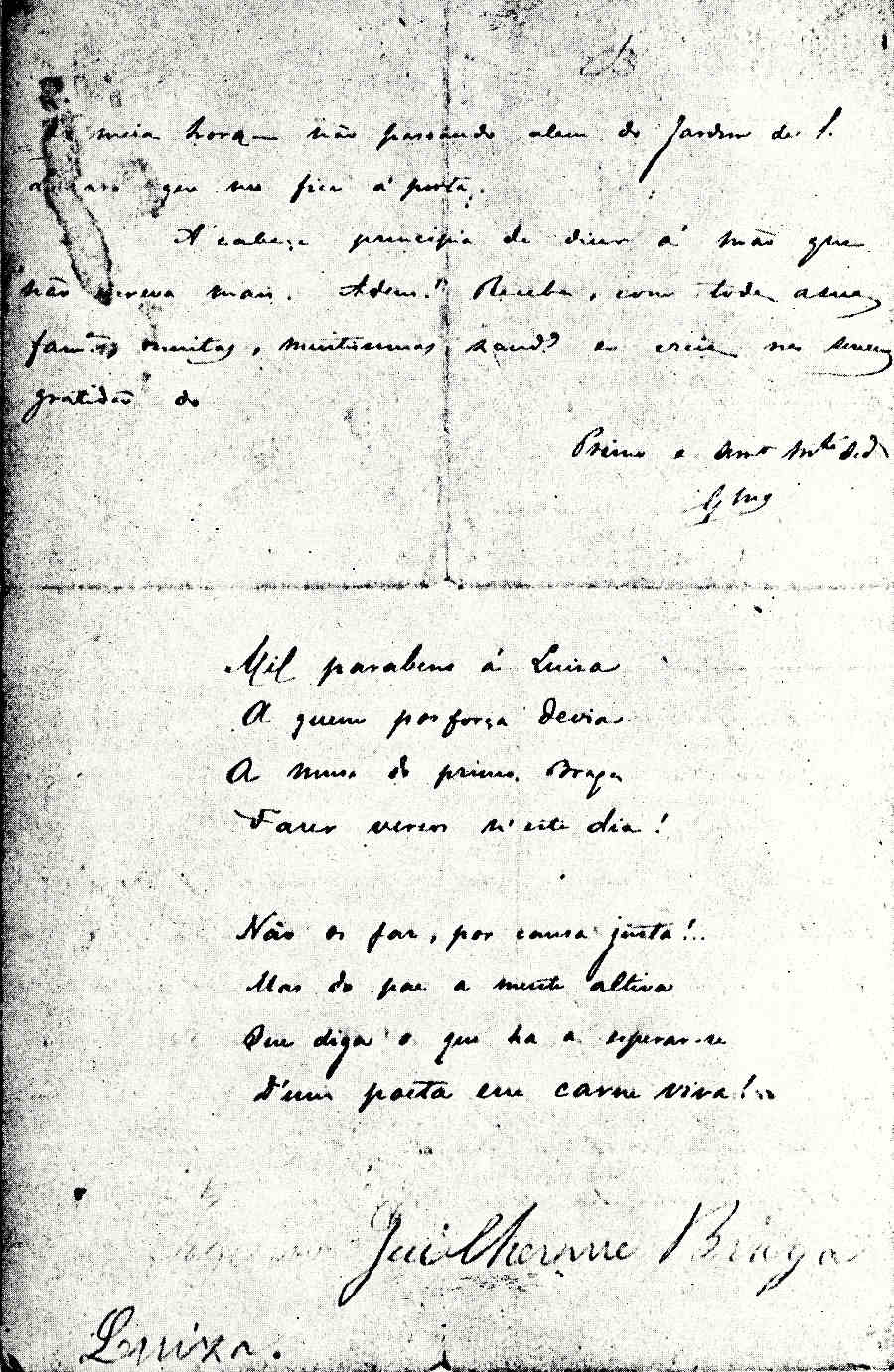 «É que eu, lembrando-me a 29 de que o dia seg.te era o 30.º não podia deixar de saudar daqui a Luísa!...»