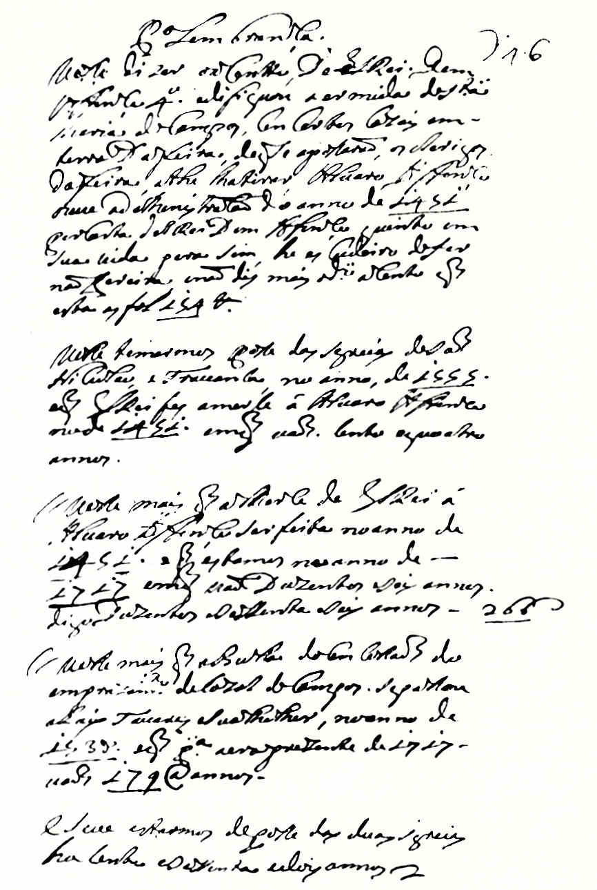 «No anno de 1660... no Castelo onde fizerão de novo a procissão pregou hum franciscano não quizerão os religiosos (os do convento) ir na procissão nem / 100 / quizerão que fosse o St.º Lenho e ouverão de aver des... mas atalhou-se a isso com levar o P. Vigr.º a reliquia na procissão a tornar a trazer com authoridade e porqe alegava a Snrª Condeça qe avia de ir reliquia e qe não avia outra e qe o parrocho da fregª tinha obrigação de a haver e mostrar resão a que se satisfez mas ficando queixosa».